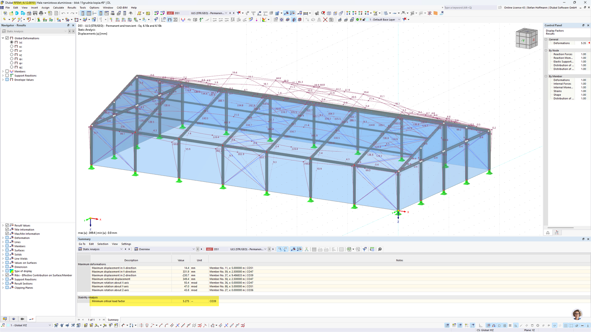 I am designing an aluminum hall. During the analysis of ultimate limit states (ULS) for combinations of variable loads, I receive error/warning no. 10037 with the message: "The required accuracy of iterative calculations has not been achieved. The results may be unreliable. Increase the maximum number of iterations." When I calculate just the structure itself – self-weight – no error appears, everything calculates correctly. However, when I also consider wind loads, the problem occurs. I increased the number of iterations from 100 to 300, but the problem remains the same.