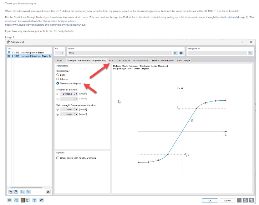 Could you please advise how CSM can be implemented in RFEM 6? Specifically, is it sufficient to modify only the stress–strain curve of the material, or are additional modeling or analysis settings required? If further changes are necessary, I would appreciate guidance on what adjustments should be made.