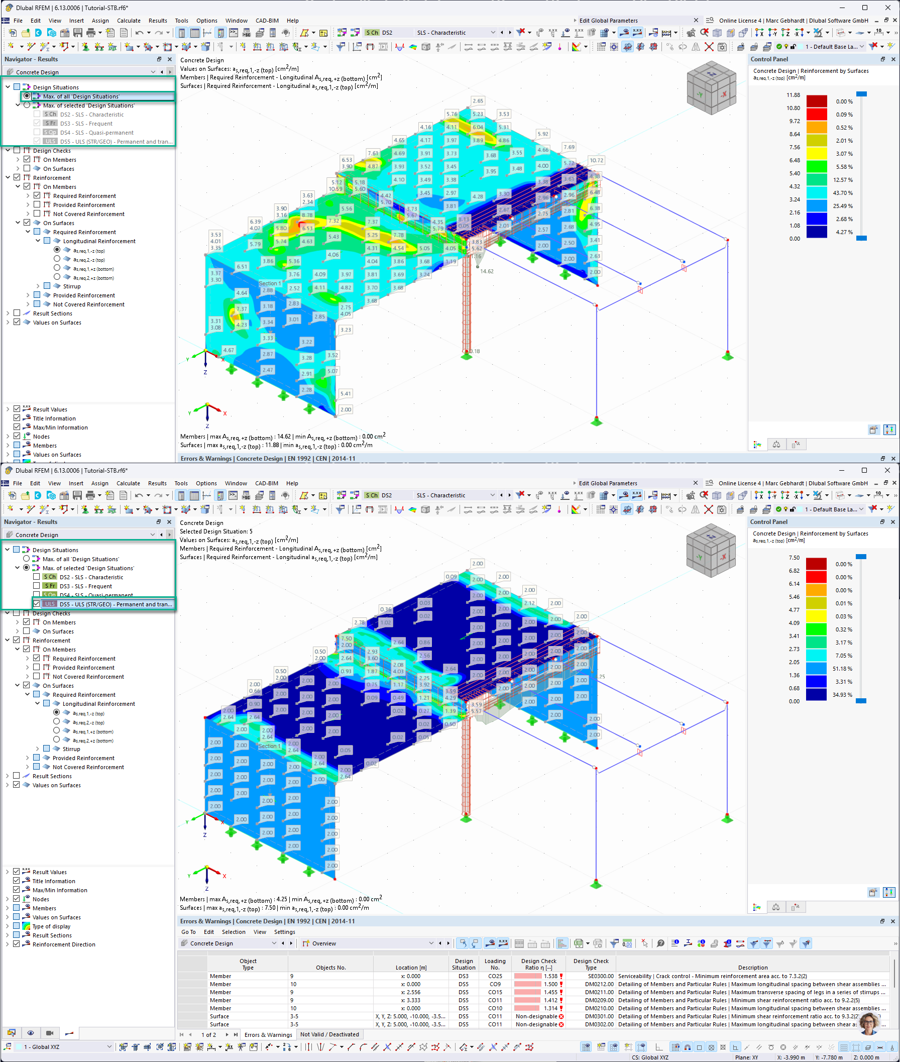 The selected reinforcement can be viewed using ULS, SLS, and as a result. In Dlubal RFEM 6, reinforcement is only displayed as the largest of the SLS and ULS values. I would like to see the same display in RFEM 6 as in RFEM 5.