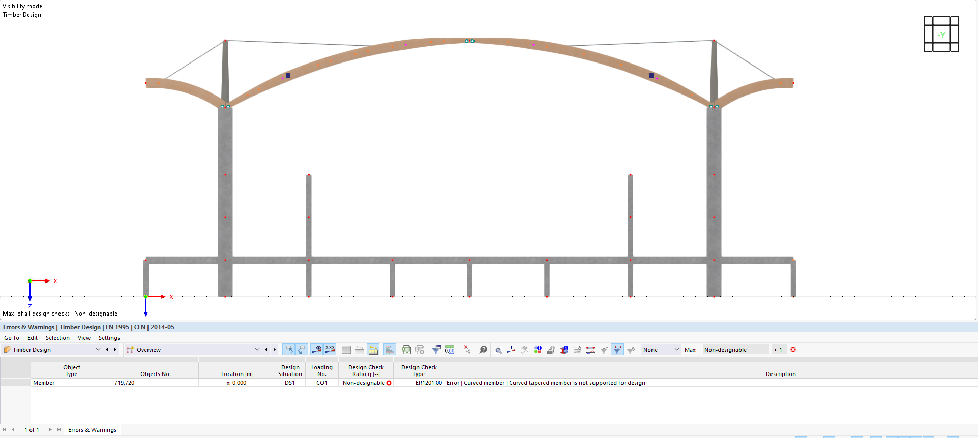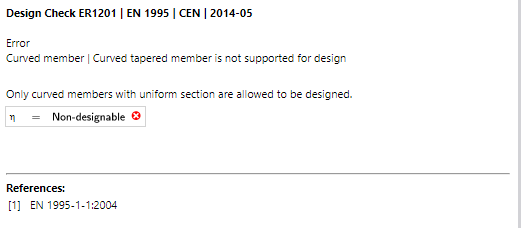 I cannot run Timber Design for a curved glulam member with a tapered cross-section. RFEM shows the error “Curved tapered member is not supported for design (ER1201). Only curved members with uniform section are allowed.”