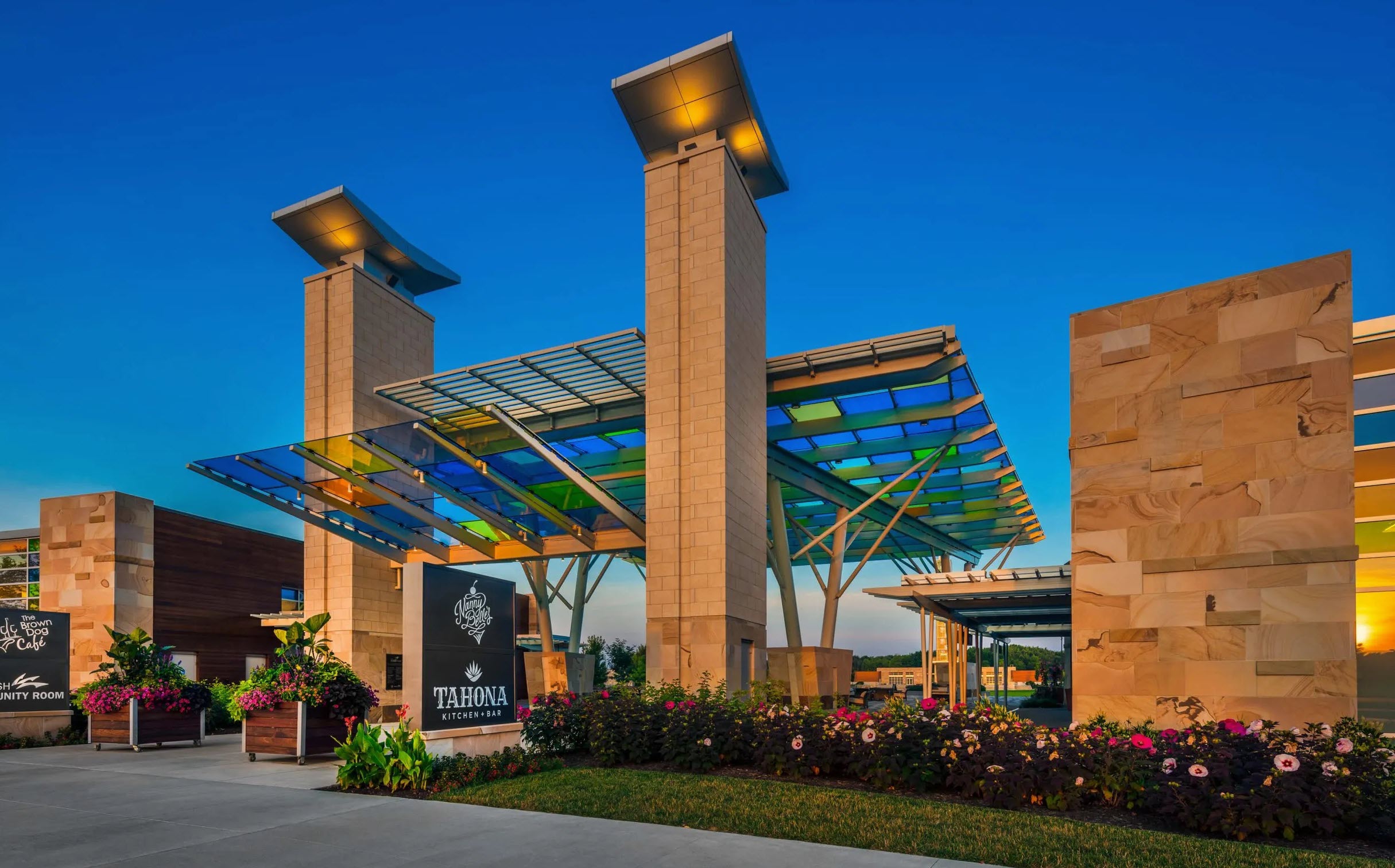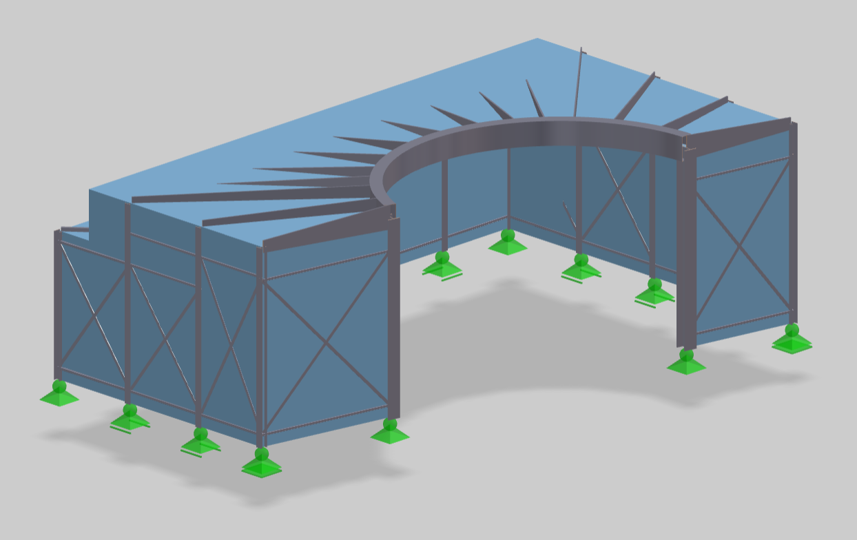 Novum Structures LLC was commissioned to design and construct this roof canopy. The structure was designed using Dlubal Software to achieve the 128-foot span of the double-layer HSS girders.