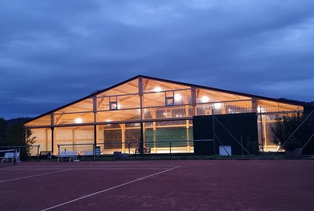 The project involves a new building of a hall over an existing tennis court. The glued-laminated timber hall has a span of 18 m (59 ft) and was built on micro screw piles.