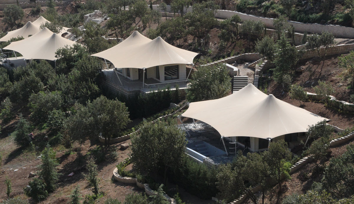 Lightweight membrane roof that protects the leisure areas of the 29-suite complex from sun and rain. The membrane roof structure was designed entirely digitally, including structural design in RFEM and wind load simulation in RWIND.
