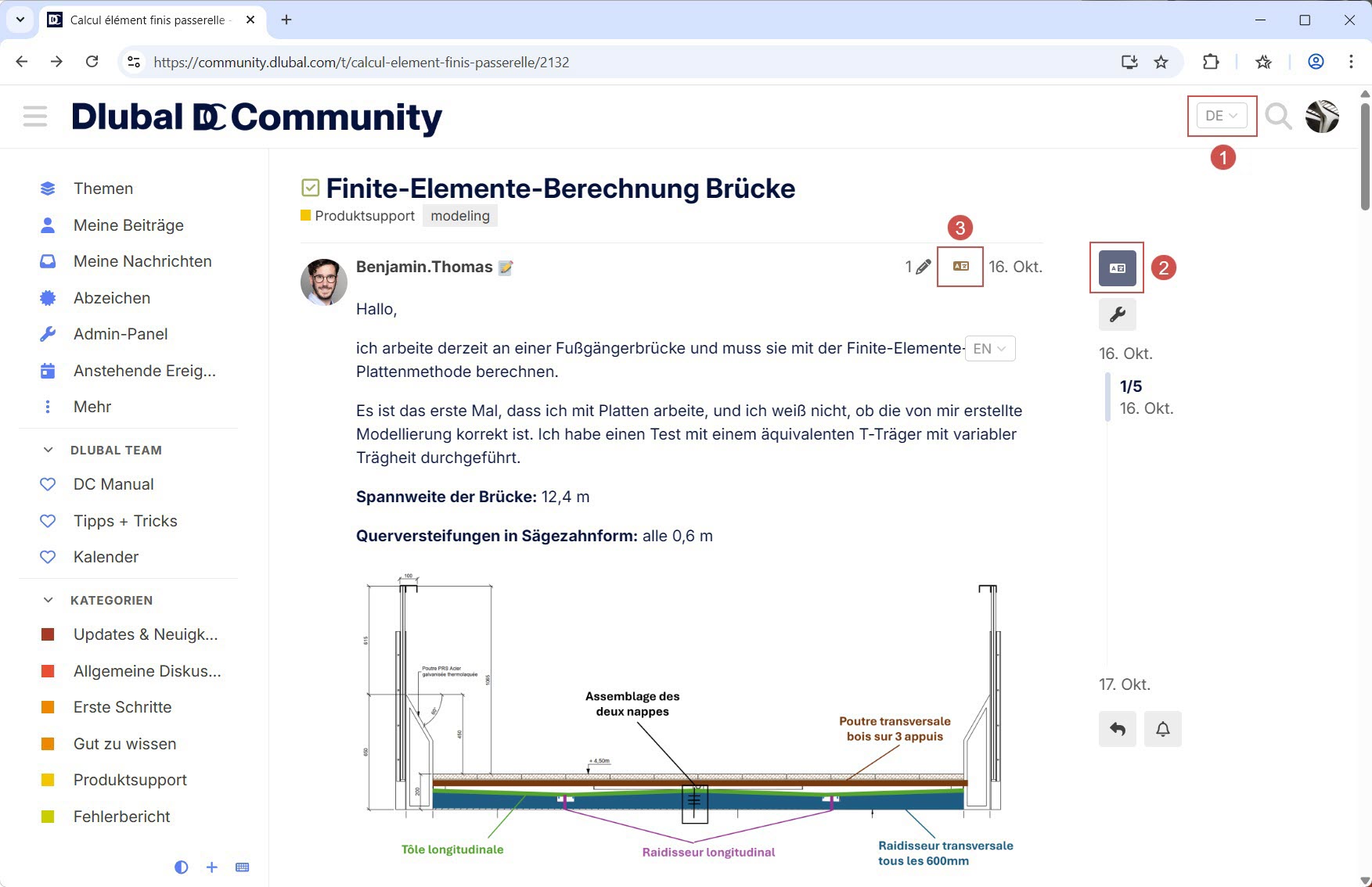 You can access the original and translated version of a post via trigger 2. Indicator 3 shows the current display: