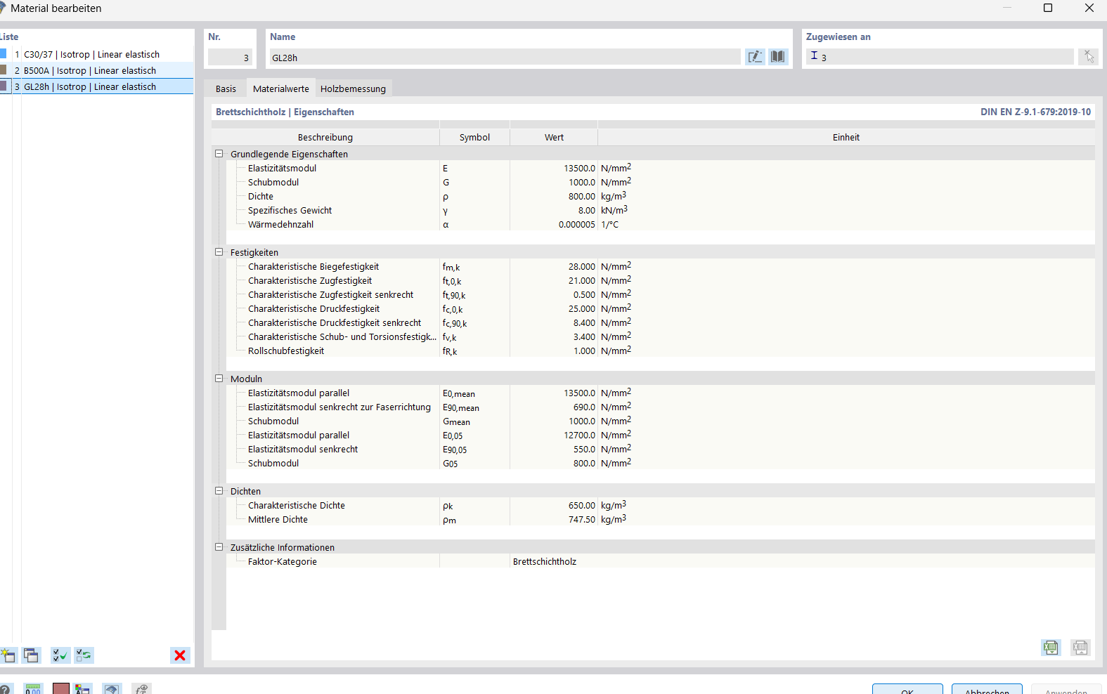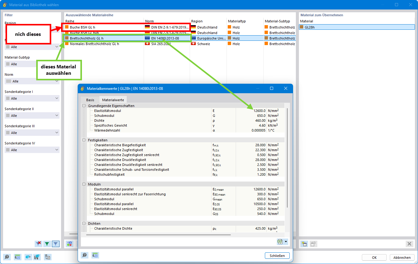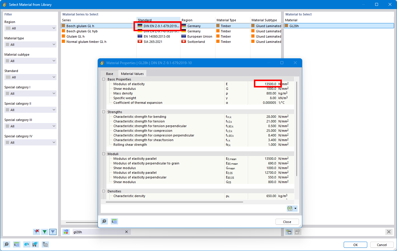 Why is the material GL28h assigned a modulus of elasticity of 13500 N/mm² (E0,mean) in the Dlubal material library, while I find a value of 12600 N/mm² in the standard?