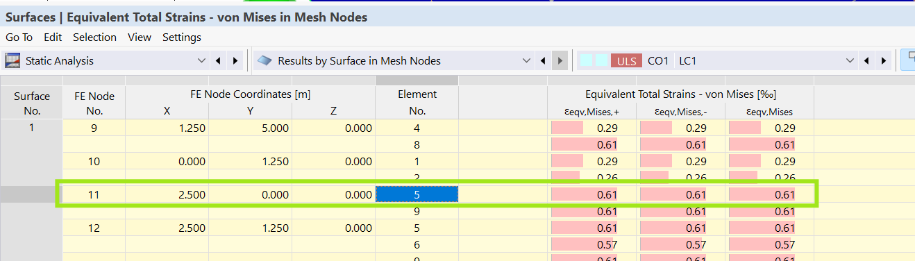 The tabular output of the static analysis results of the comparison strain according to Mises of load combination 1 also corresponds to these 0.61: