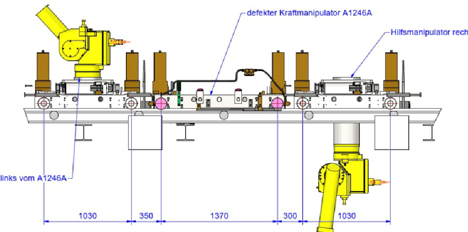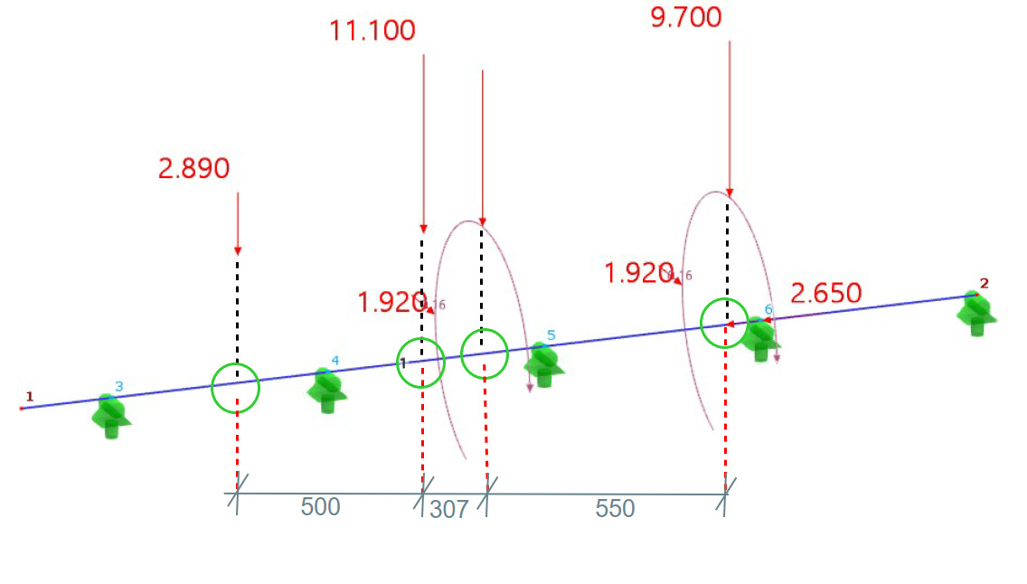 The points on the rod where a load acts in the considered load case/load combination are the ones circled in green; it would be practical to be able to “catch” these points with the command for new linear dimensioning. In the structural analysis I created, several “robot-like” manipulators move along the rail, and for a certain operation, it must be demonstrated or checked at what minimum distance from each other they may operate. Furthermore, there are often purely constructive distances due to the dimensions of these robot-like manipulators, which prevent the wheels from standing tightly next to each other. Therefore, it is particularly important to be able to represent the distances between the respective wheels, which arise as loads from the moving load assistant. This is not an exotic special case for us either; in another structural analysis of a small steel hall, such manipulators also move on two levels, distributing their wheel loads over several rollers stacked above each other. It would likewise have been advantageous there to be able to represent the wheel distances among each other or, if necessary, from wheel load to other nodes.