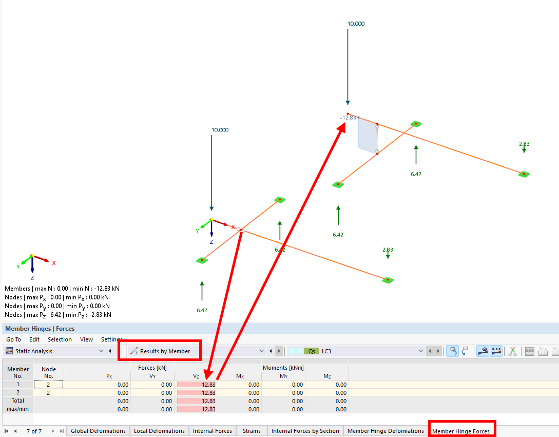 Personally, I’m not fond of this modeling method. The two members don’t share a common node, which can be a disadvantage when it comes to design aspects such as segmentation for stability and deformation. Of course, you could insert a node to connect them, but this would require working with member sets for the design. The advantage, however, is that you can use scissor hinges to release specific degrees of freedom (DOF).
