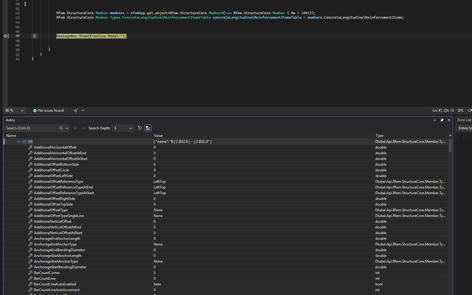 Hello, I’m new to the Dlubal API. I want to retrieve information about the column’s longitudinal reinforcement, for example diameter, start point, end point, and position.