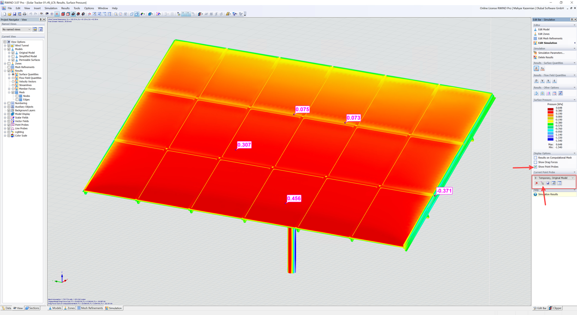 RWIND uses a numerical CFD (Computational Fluid Dynamics) approach to simulate wind flow around structures in a virtual wind tunnel. The airflow is governed by the Navier–Stokes equations together with an appropriate turbulence model (typically RANS). In this framework, pressure and velocity are not derived from each other using a single formula; instead, they are solved simultaneously as part of the governing equations of the flow.