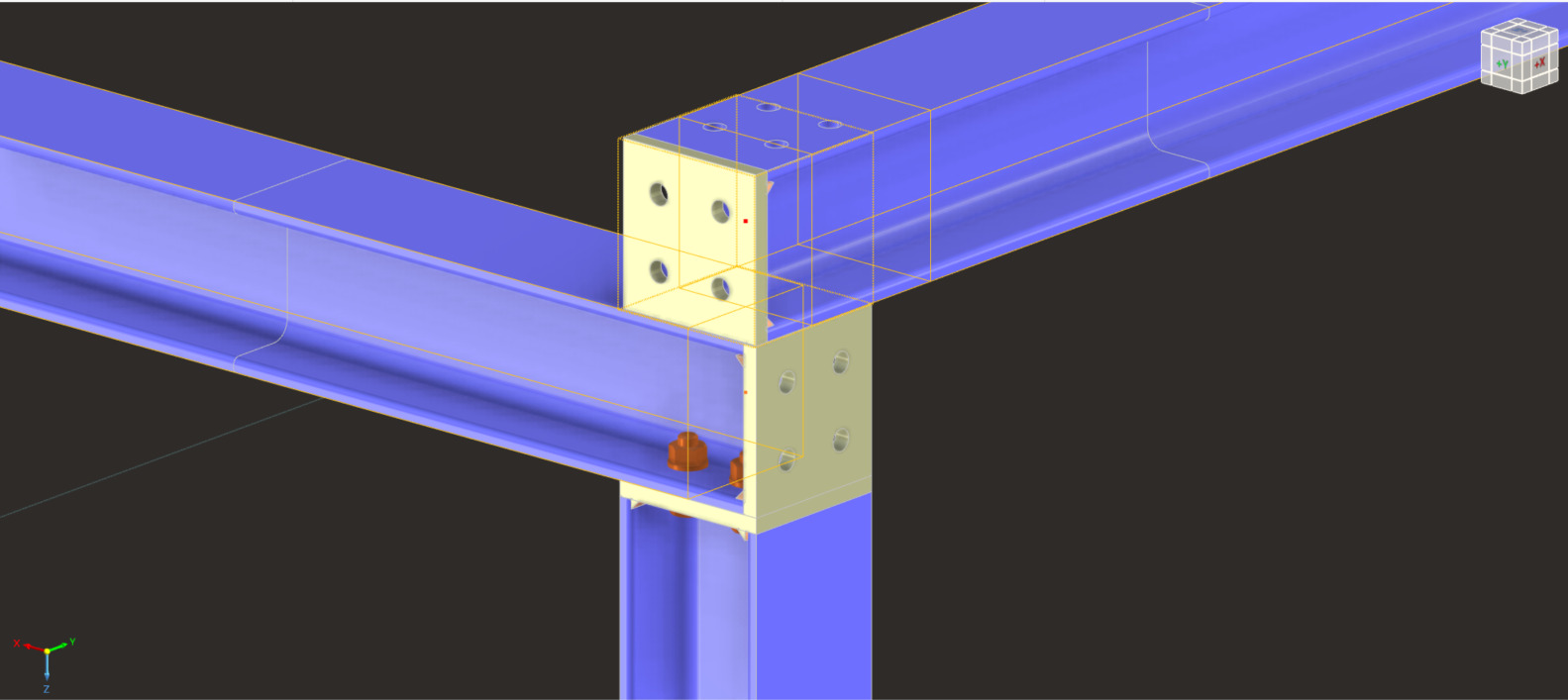 I am trying to bolt the two beams, which are selected in the image, together in a similar manner to how the column is bolted to the middle beam above. I am currently running into an issue where I’m unable to have the two beams, which are on different Z-planes, interact at the same node.
