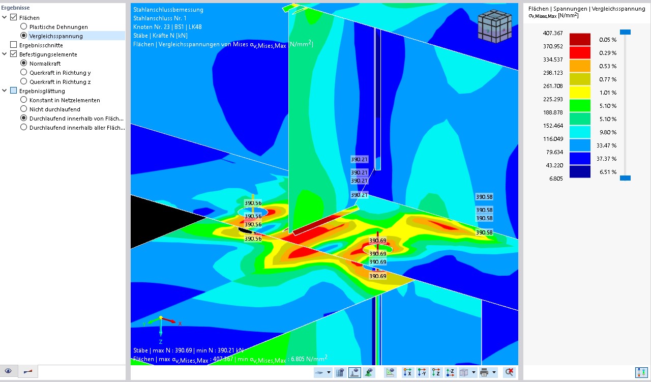 In der Auswertung wird dann eine sehr hohe Vergleichsspannung angezeigt. Ich weiß allerdings nicht genau, wie RFEM die Kehlnähte intern berechnet.