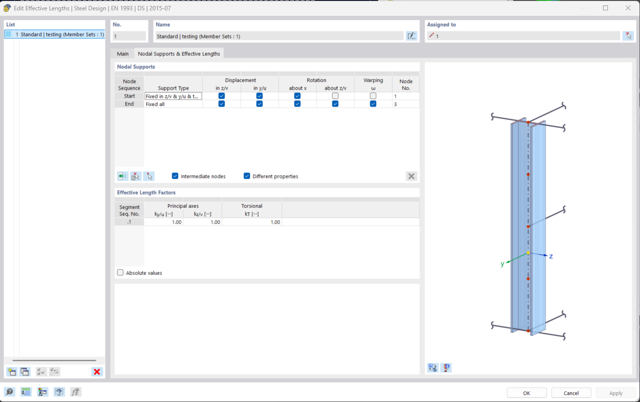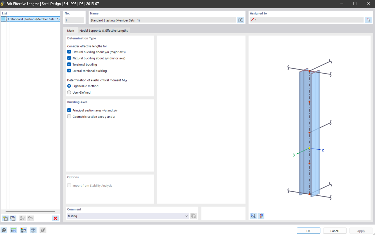 { "comment": "testing", "memberSets": [ 1 ], "flexuralBucklingAboutY": true, "flexuralBucklingAboutZ": true, "torsionalBuckling": true, "lateralTorsionalBuckling": true, "nodalSupports": { "rows": [ { "no": 1, "supportType": "SUPPORT_TYPE_INDIVIDUALLY", "supportInZ": true, "eccentricityType": "ECCENTRICITY_TYPE_NONE", "supportInY": "SUPPORT_IN_Y_SUPPORT_STATUS_YES", "restraintAboutX": "RESTRAINT_ABOUT_X_SUPPORT_STATUS_YES", "restraintAboutZ": "RESTRAINT_ABOUT_Z_SUPPORT_STATUS_NO", "restraintWarping": "RESTRAINT_WARPING_SUPPORT_STATUS_NO", "nodes": [ 1 ] }, { "no": 2, "supportType": "SUPPORT_TYPE_FIXED_ALL", "supportInZ": true, "eccentricityType": "ECCENTRICITY_TYPE_NONE", "supportInY": "SUPPORT_IN_Y_SUPPORT_STATUS_YES", "restraintAboutX": "RESTRAINT_ABOUT_X_SUPPORT_STATUS_YES", "restraintAboutZ": "RESTRAINT_ABOUT_Z_SUPPORT_STATUS_YES", "restraintWarping": "RESTRAINT_WARPING_SUPPORT_STATUS_YES", "nodes": [ 2 ] }, { "no": 3, "supportType": "SUPPORT_TYPE_NONE", "supportInZ": false, "eccentricityType": "ECCENTRIC...
