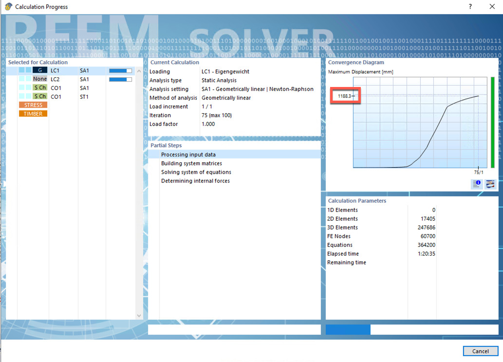 So, now the cause seems to be clear. Load cases 1 and 2 did not converge. The model is apparently unstable. The load increase leads to ever larger deformations and does not find an end.