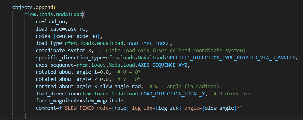 I'm trying to create horizontal nodal loads using the RFEM 6 Python API with has_specific_direction=True and SPECIFIC_DIRECTION_TYPE_ROTATED_VIA_3_ANGLES. The loads are being created successfully (no errors), but they appear in RFEM with zero magnitude and the "Specific Direction" checkbox is unchecked.