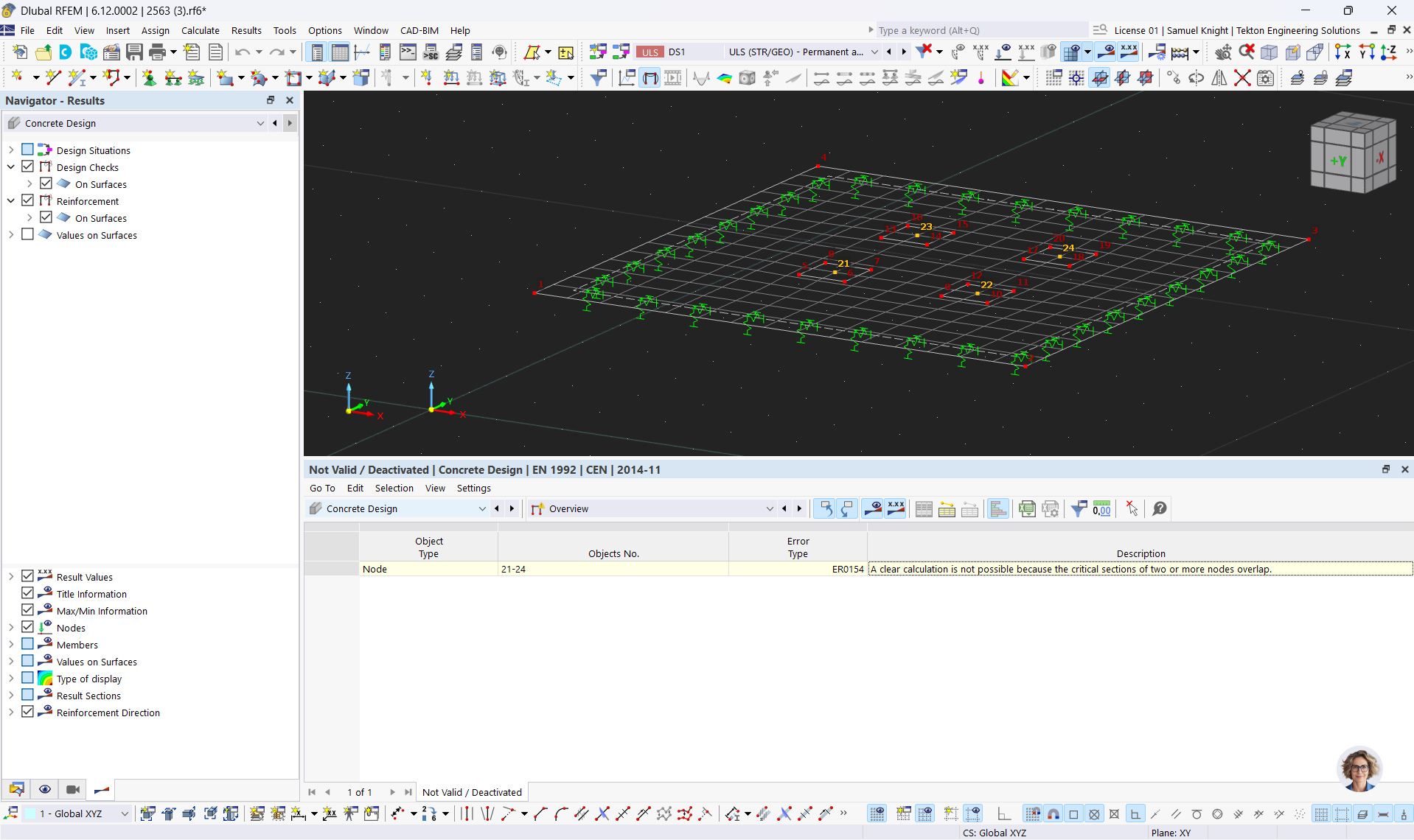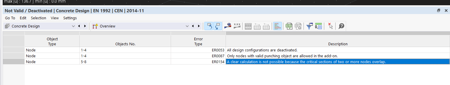 In the UI I have checked the boxes in the 4 nodes to enable punching design, and run the concrete design but I get the error "One or more nodes have a dimensionless node load. Punch calculation is not allowed."