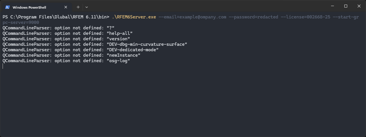.\RFEM6Server.exe --email=example@example.org --password=123 --license=000005-25 --start-grpc-server=9000