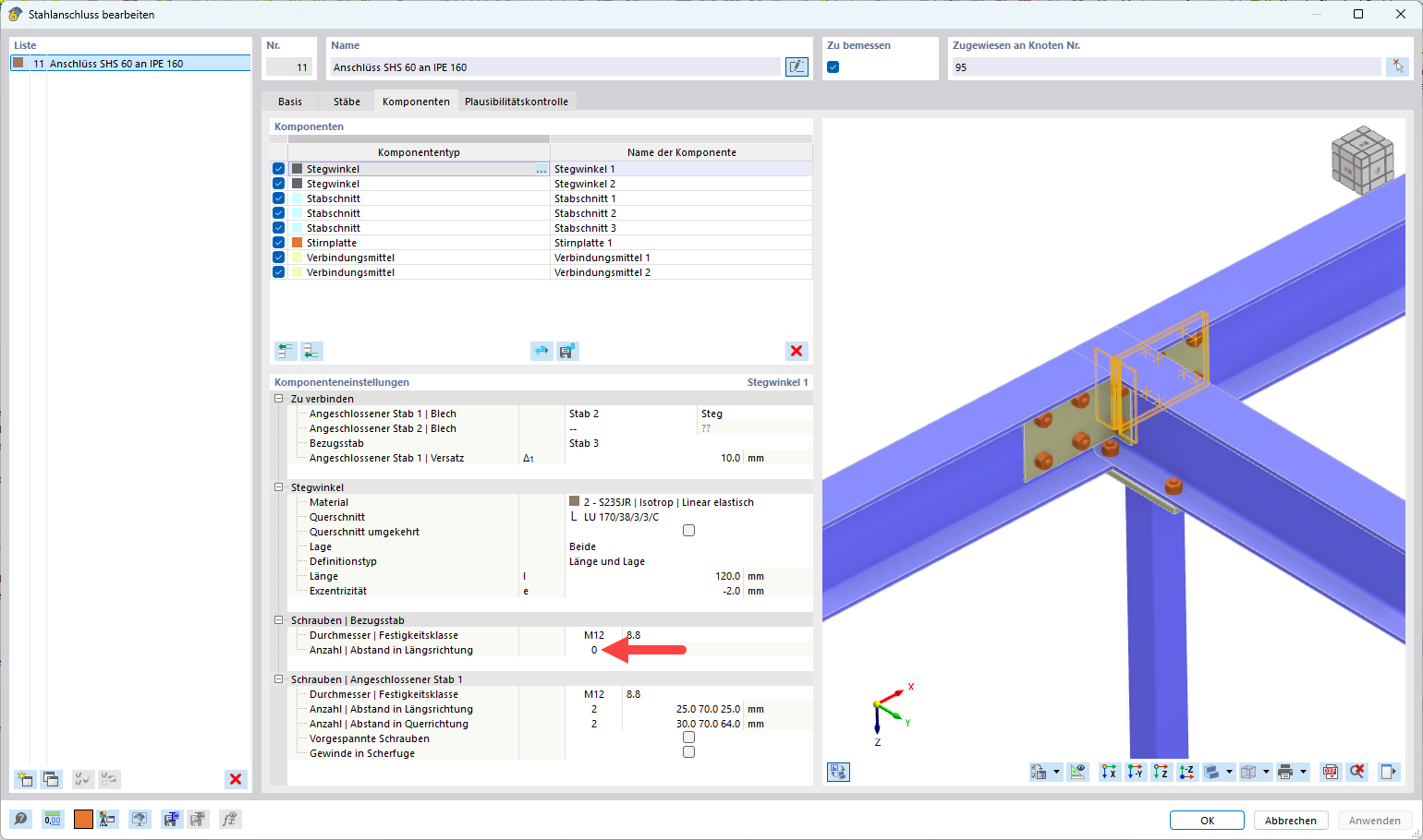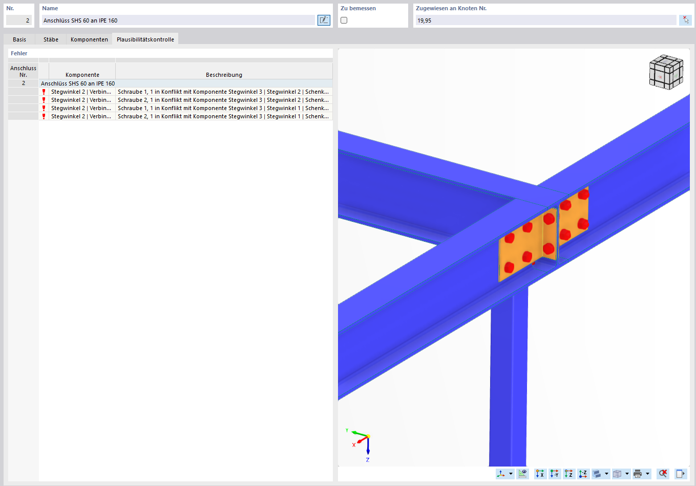 This concerns the connection SHS 60 to IPE 160 (see attached screenshot). Despite adjusting the bolt rows, the conflict still occurs.