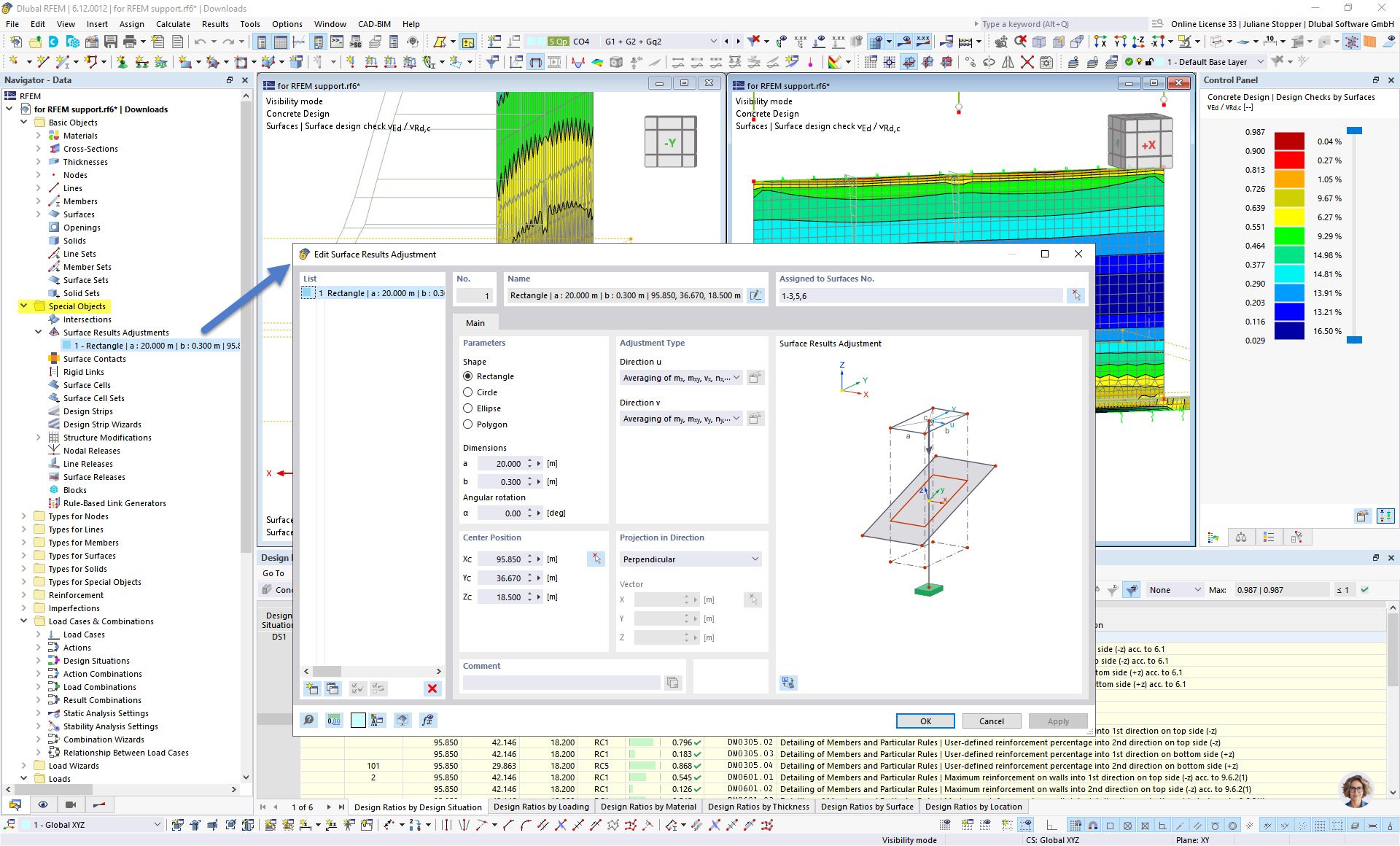 Added a surface result adjustment with a height of 0.3 m (as you had defined in the supports dimension) to model a more realistic load transfer at the support location