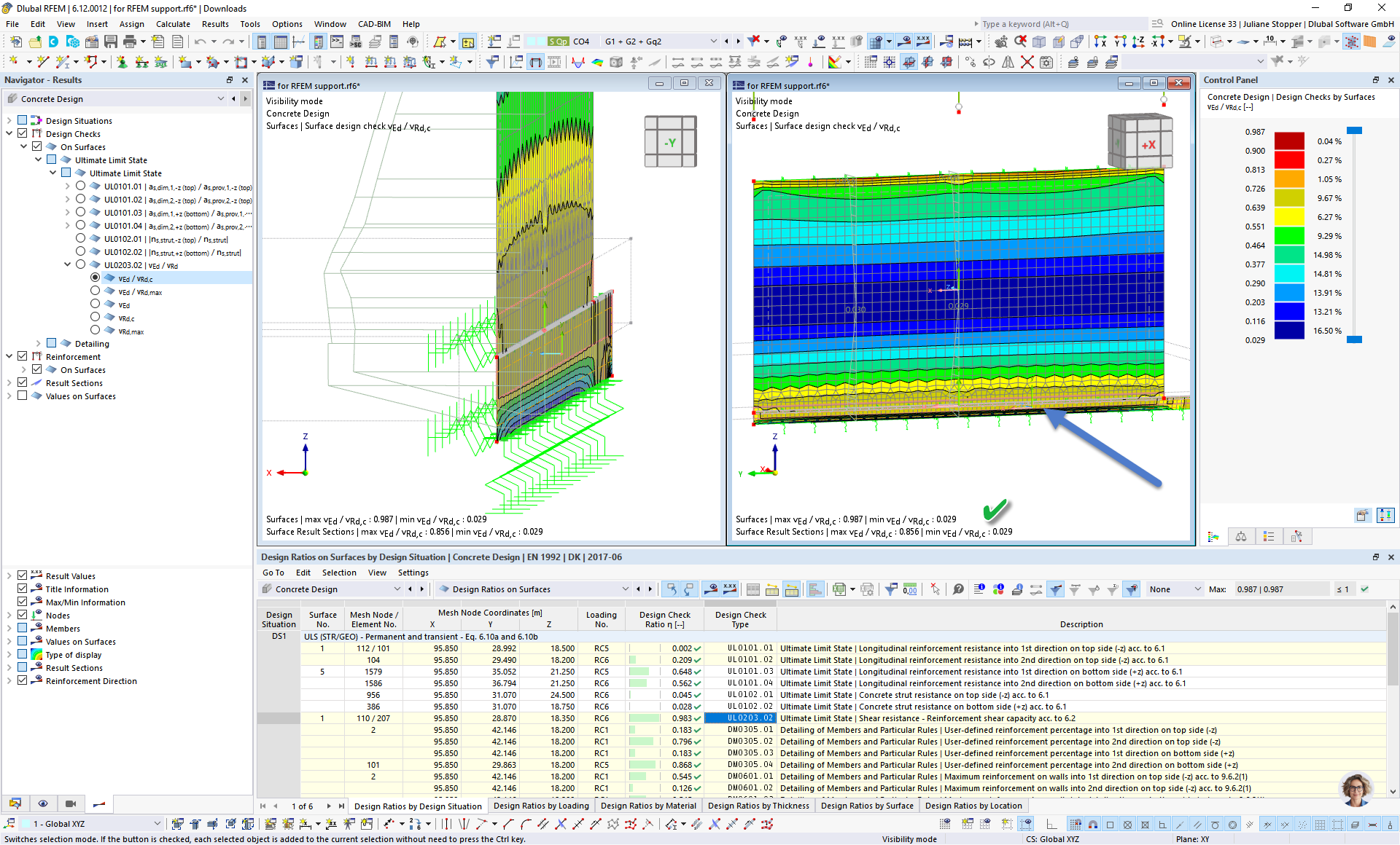 After these adjustments, the model behavior improved at the line support, and the design checks are now fulfilled. See images below.