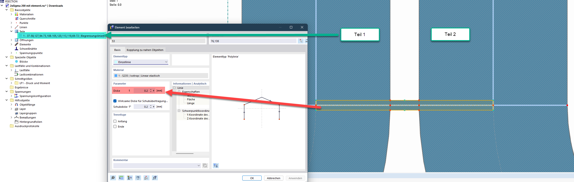 Shear elements: Set the thickness of the shear elements to t = 0. Only enter a value greater than 0 for the shear thickness t*. This way, the single field on the shear element, which is not meaningful for the cross-section classification at this point, will also disappear.