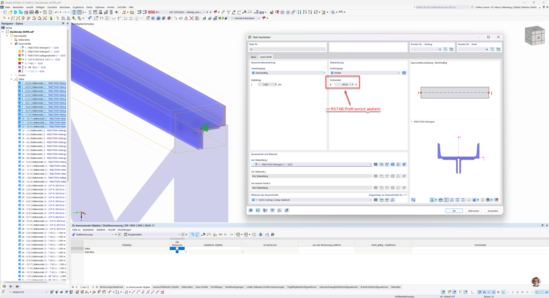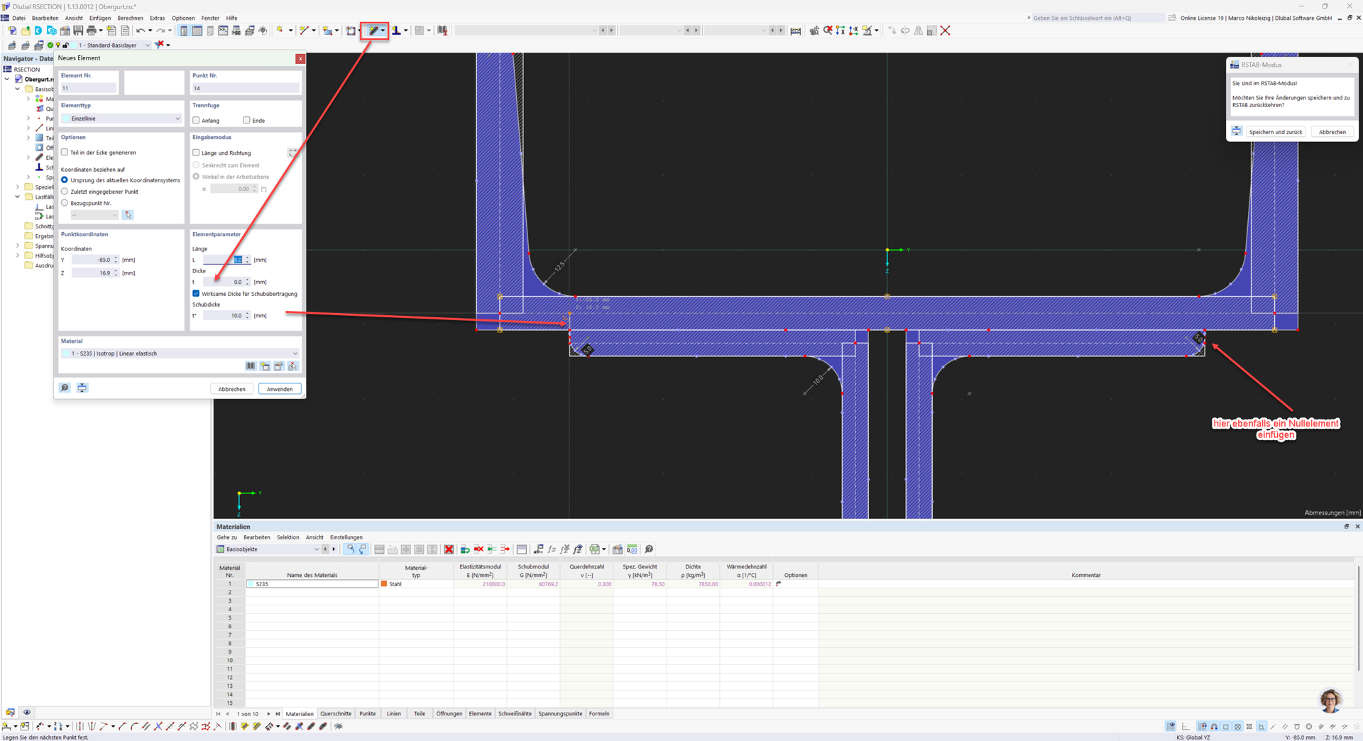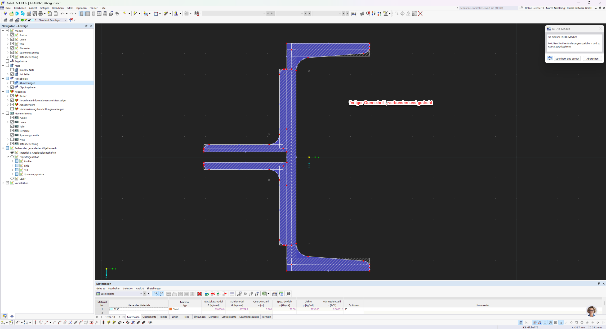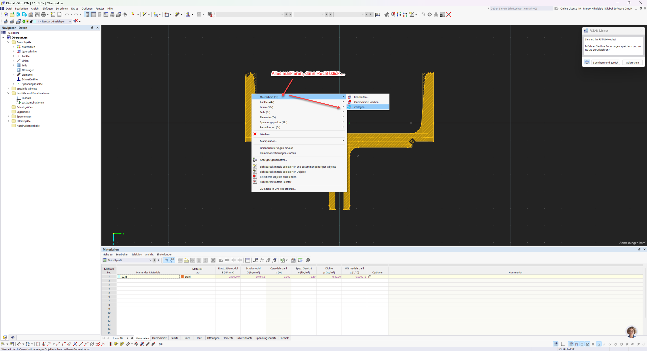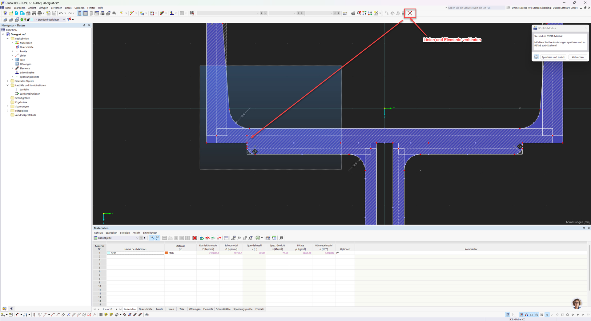 For composite cross-sections created in RSECTION, it is important that the individual cross-section parts are connected to each other, otherwise you will receive a corresponding error message in RSTAB.
