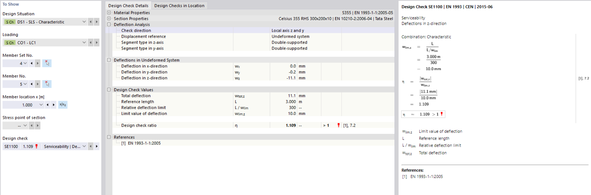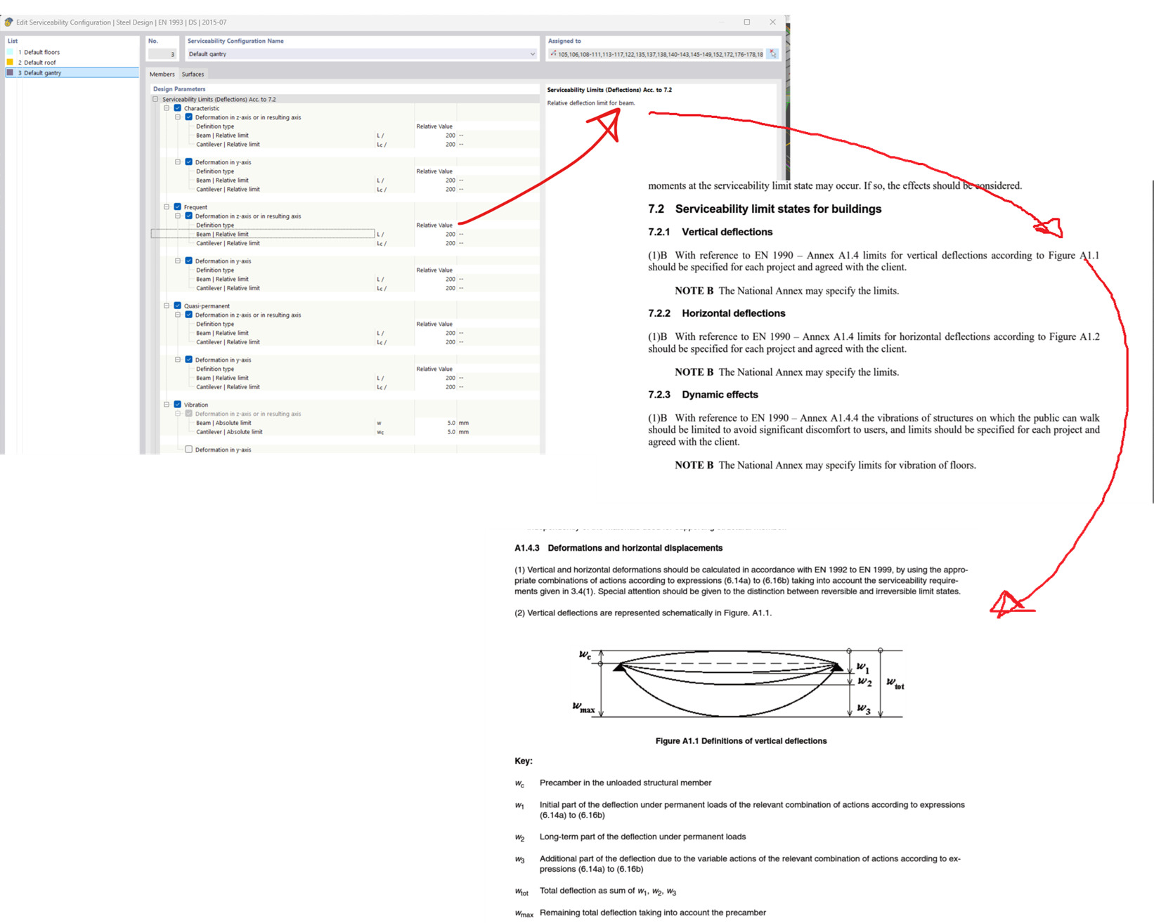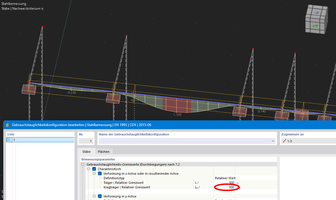 settings of the SLS design check and tracing of the address in the Eurocode given by the steel add-on shown below. The Eurocode image only defines local/relative deformation of the member.
