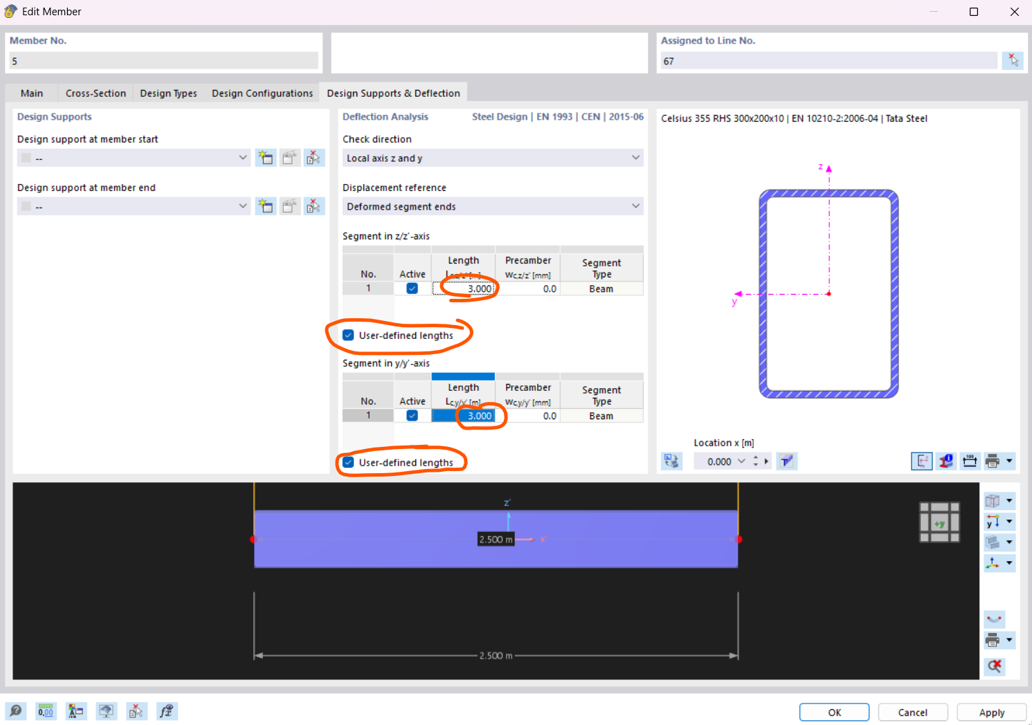 There are two member sets meeting each other to the left of the mid-span with a hinge. I defined design supports at both ends, and applied SLS check to them. The check is not picking up the exceeding deflections.