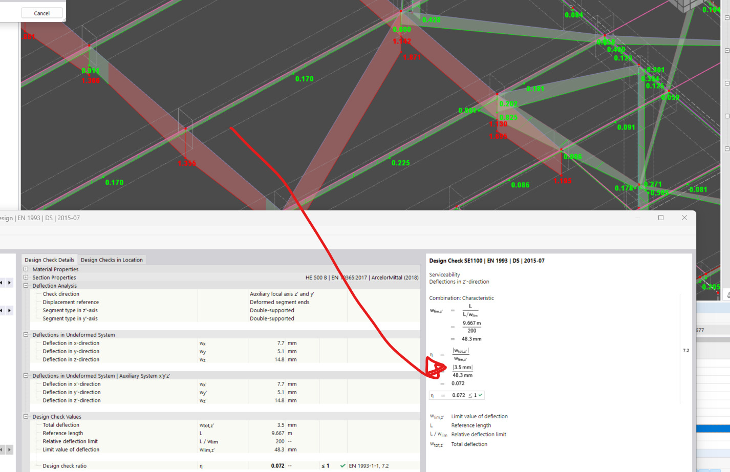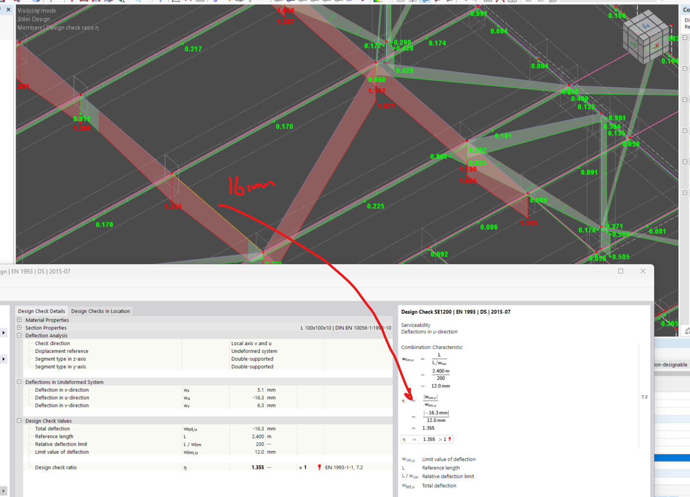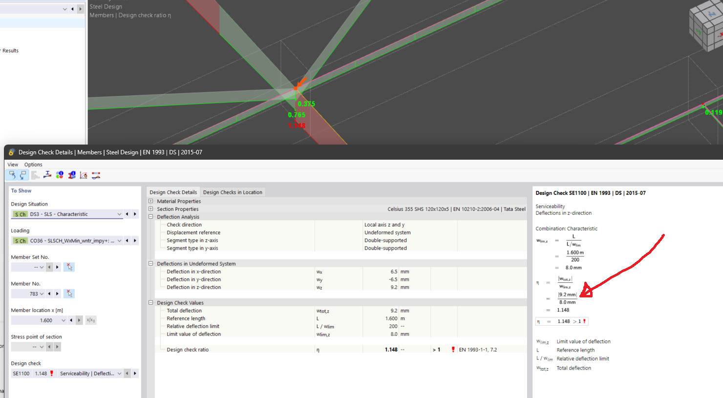the bigger problem happens when the same SLS deflection design check gives different design ratios for two members that are connected to the same point: one design ratio is 1.35 and the other is 0.07 as in the images below.