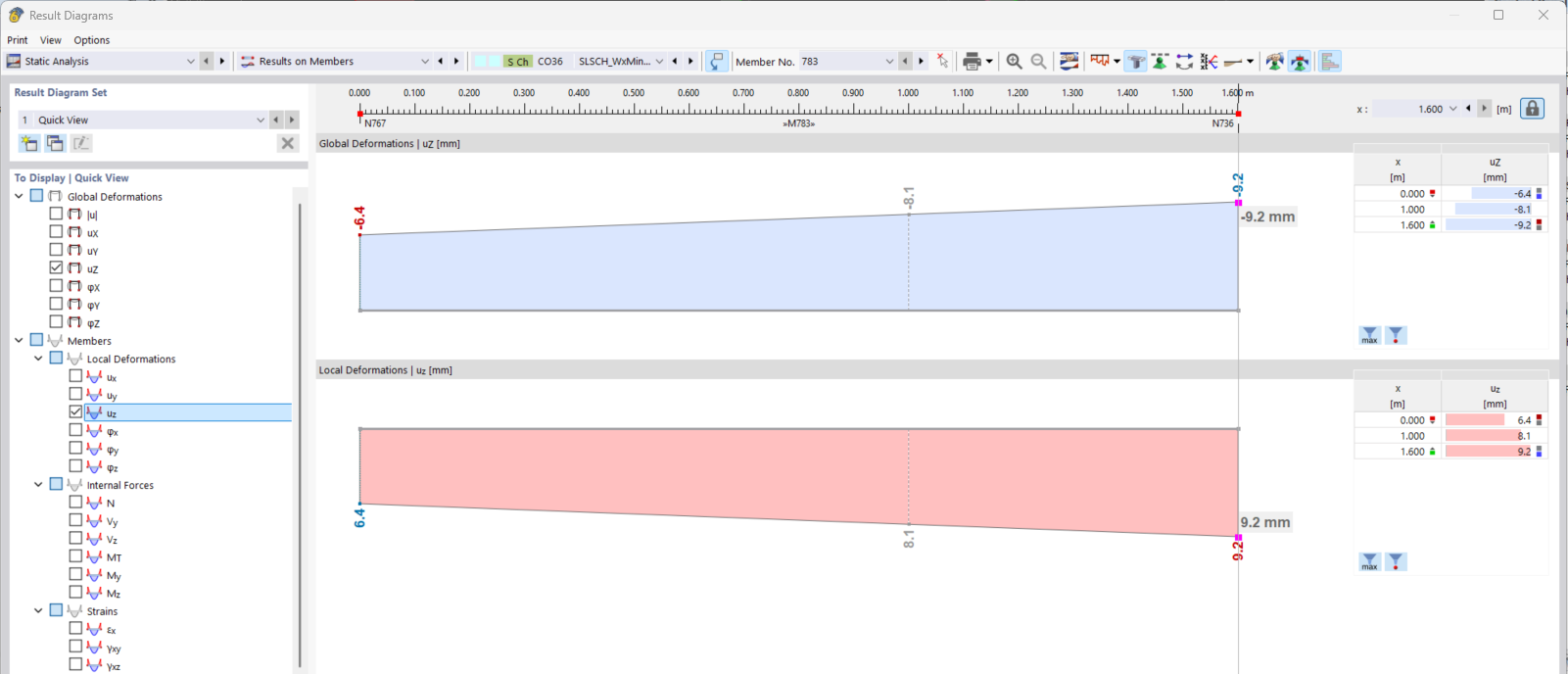 global and "local" displacement values in diagram view. Local is only given in the member local coordinate system, not really a relative deformation. (how to even see it?)