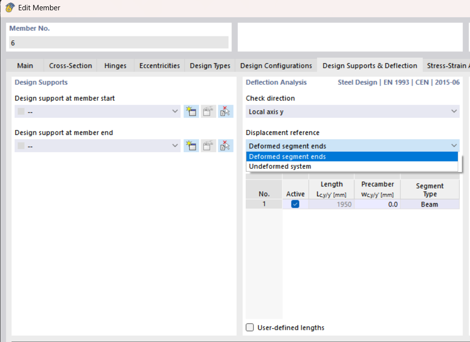 The steel design add-on uses a "relative" deformation limit (e.g. L/200) and compares it with the maximum global deformation (delta1 in image below) for the SLS design check.