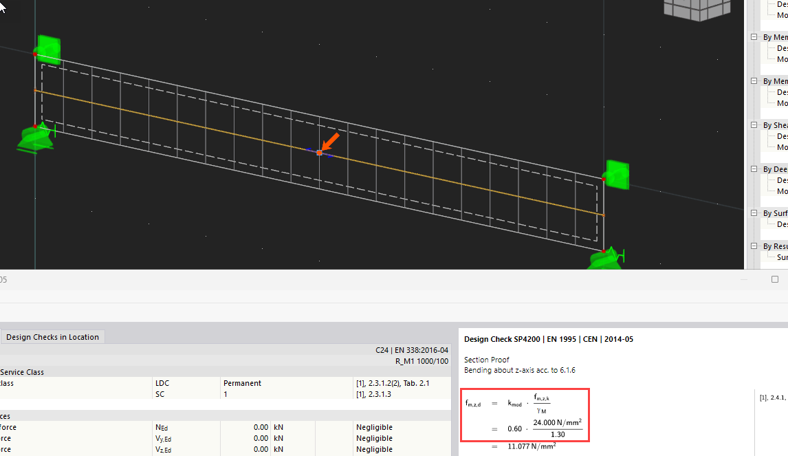 I modelled the CLT beam as a multilayer surface and I wanted to do a layer-wise ULS design check (via the 'Timber Design add-on') at surface-grid points (and/or mesh-node points). Here the stress-interaction formulations are called up on where the bending normal stress from "in-plane bending" and the normal stress from "axial loading" are treated as if they both resulted from "axial loading". Only the stress resulting from out-of-plane bending is considered as "bending normal stress" in the design checks. In the end, a uniaxial (out-of-plane) bending normal stress is interacting with an "axial normal stress" resulting from both in-plane bending (!) and axial force instead of an interaction between biaxial bending normal stresses and a normal stress from an axial load. I hope I explained it a little better. Thank you once again Paul!