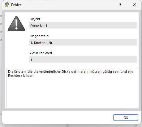 Unfortunately, it is still not possible to define variable shell thicknesses for surfaces for general Nurbs surfaces in RFEM. When attempting this, the following error message appears: