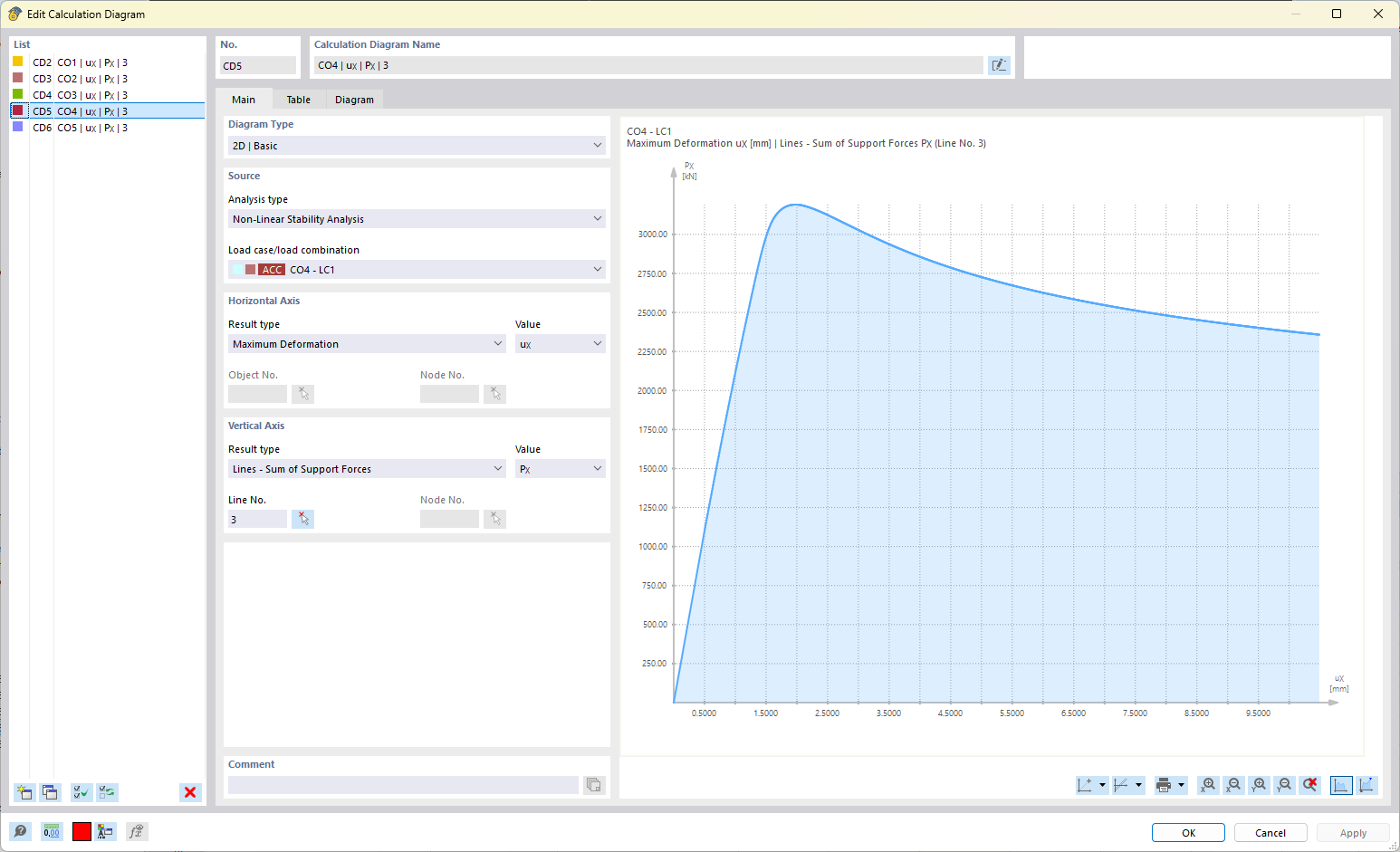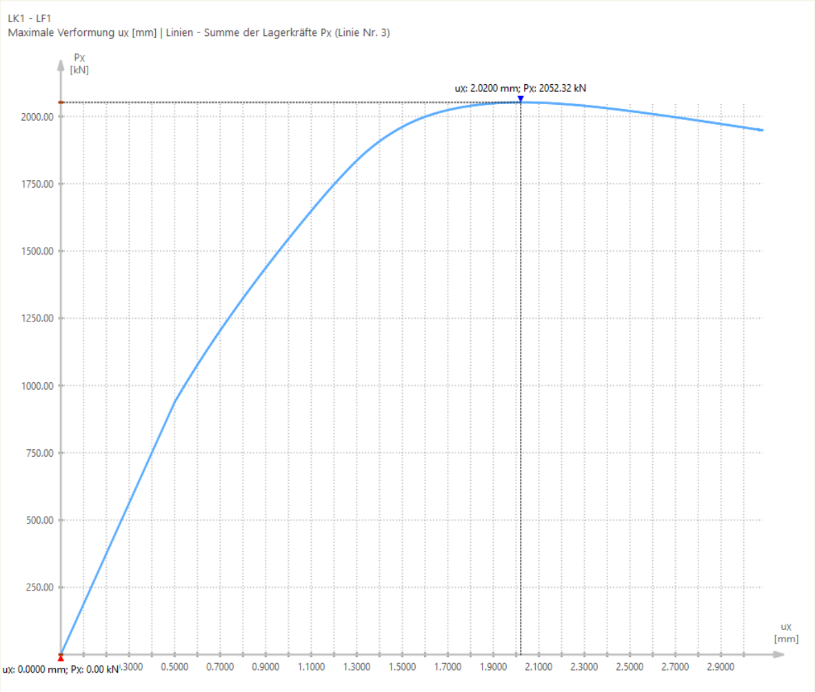 The calculation results of the first two load cases (imperfection from eigenmode 1) look good. The load-displacement diagram can be plotted beyond the limit load (see Image 1). The calculation of load cases 4 and 5, according to the load-displacement diagram, breaks off far too early (see Image 2). The results of the von Mises equivalent stress also show that the material in these load cases does not even yield at the last achieved load step.