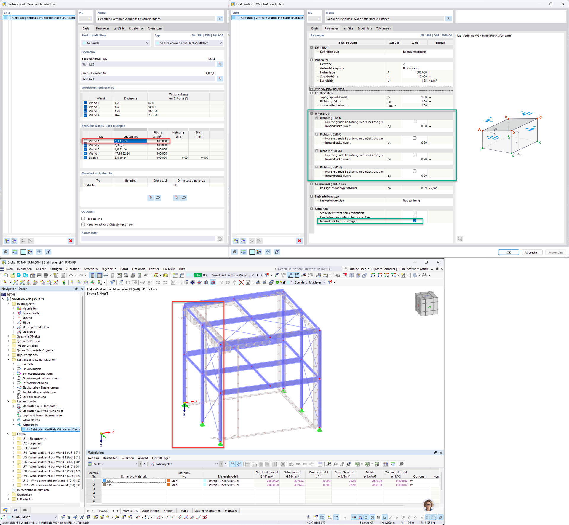 However, one solution could be to adjust the loads generated by the load assistant. For this, the load assistant Wind Loads is used for the preset. From my point of view, it is important here to consider the internal pressure. How this can be determined is shown in this technical article. Likewise, individual walls can be disregarded here. Please see the following image: