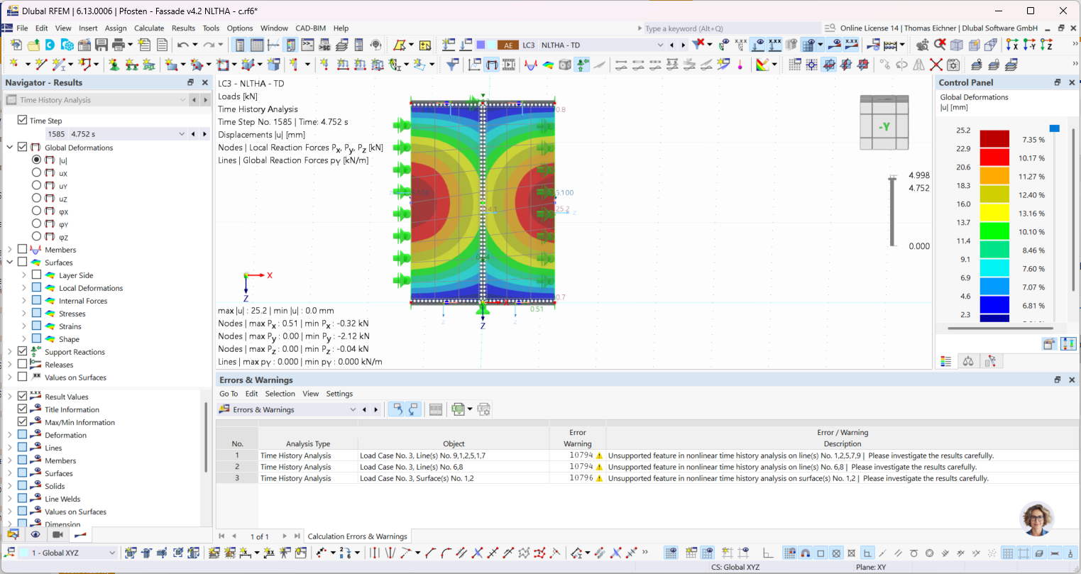 Thank you for your help, there is the possibility to apply two loads on the panes or a combined load on the center of the post, but unfortunately no results for the time history analysis in both cases, neither linear nor nonlinear.