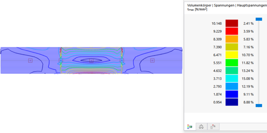I assume you are interested in the "direction-based" transverse force. For this, look at the principal stress tau_xz. Due to the short volumetric bodies at the third points, it is advisable to form a volumetric body set so that smoothing through the volumes works: